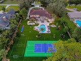 A sleek, modern retreat with open-concept living spaces and a sprawling outdoor playground featuring multiple sports courts and a cozy fire pit—perfect for both relaxation and active fun.