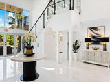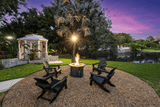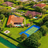 A chic, modern villa with luxurious spaces and an outdoor haven featuring sports courts and a fire pit.